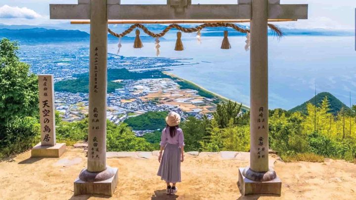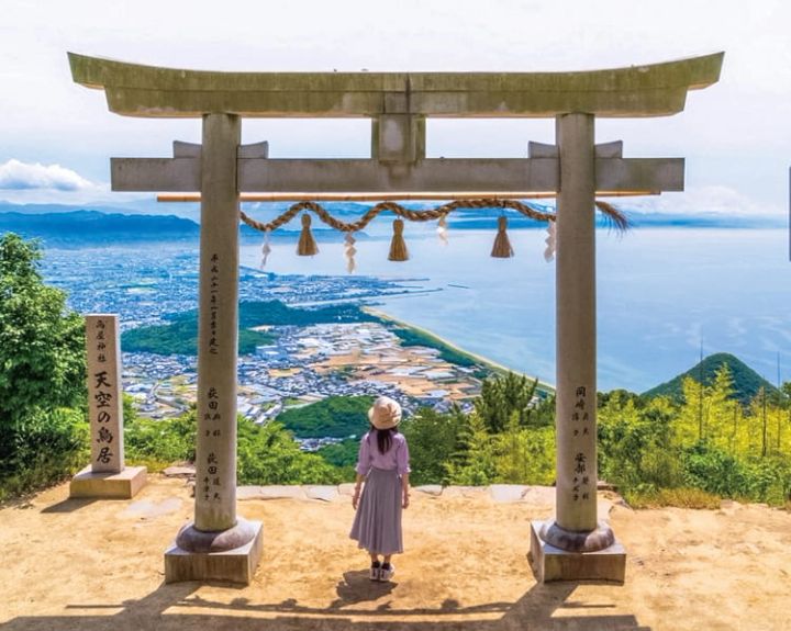 標高404mの稲積山の山頂にある本宮。その鳥居越しに見る、有明浜と観音寺市街はまさに絶景!