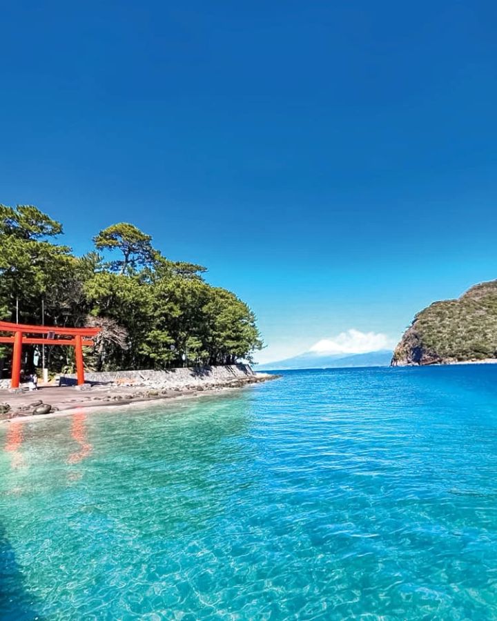 諸口神社を訪れると透明度抜群な青く透き通る海と富士山が見える絶景がお出迎え。