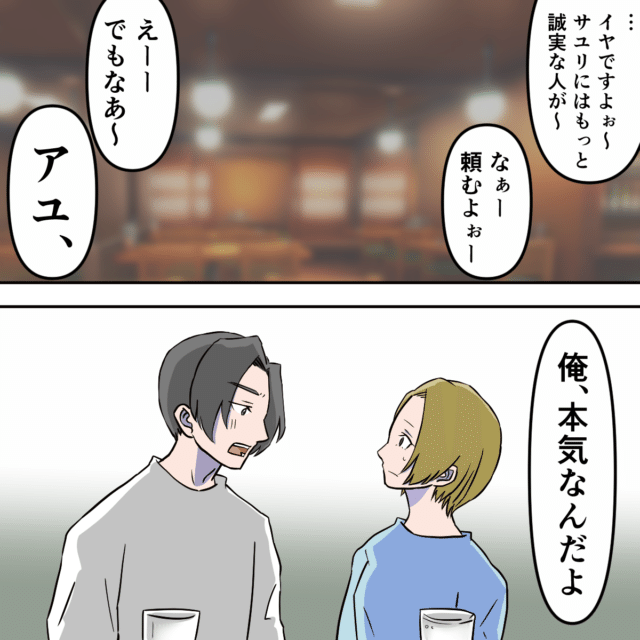 「俺、サユリちゃんこと本気で気に入ってるんだけど、協力してくんない?」タクマさんにそう言われたアユさんは、「・・イヤですよぉ~。サユリにはもっと誠実な人が~」「頼むよぉ」協力して欲しいと何度も言うタクマさんは、「アユ、俺、本気なんだよ」真剣な表情でアユさんに言いました。