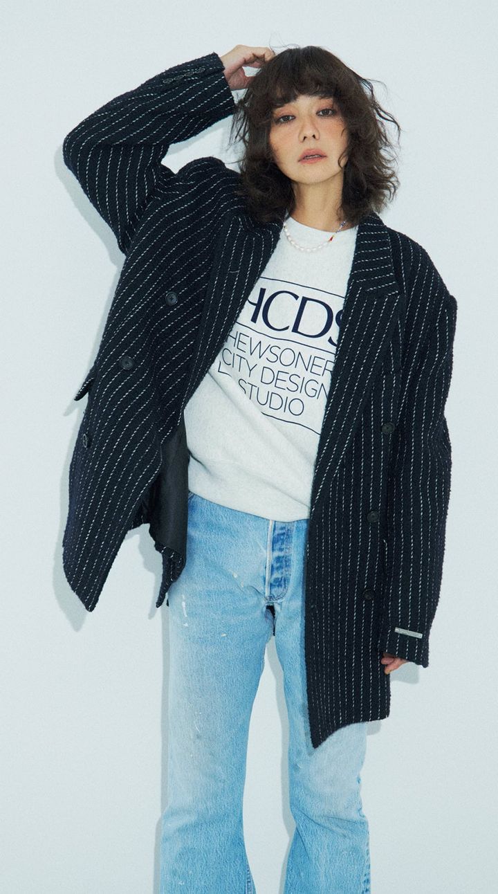 ジャコット¥46,200(プランクプロジェクト/プランクプロジェクト 青山店)、スエット¥14,300(チャンピオン フォー アダム エ ロペ/アダム エ ロペ)、デニムパンツ¥48,400(ジェニー ブルー/ウィム ガゼット ルミネ新宿店)、ネックレス¥19,800(エリウ/トゥモローランド)