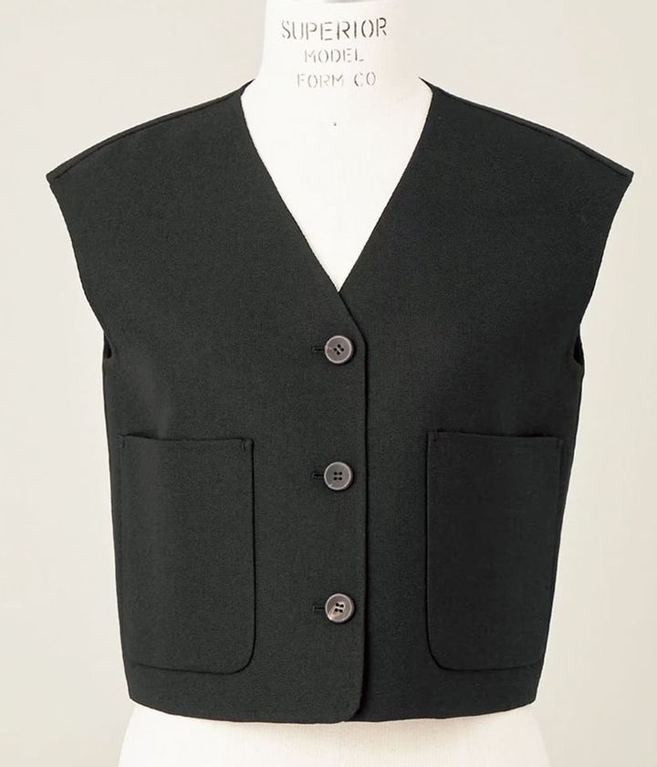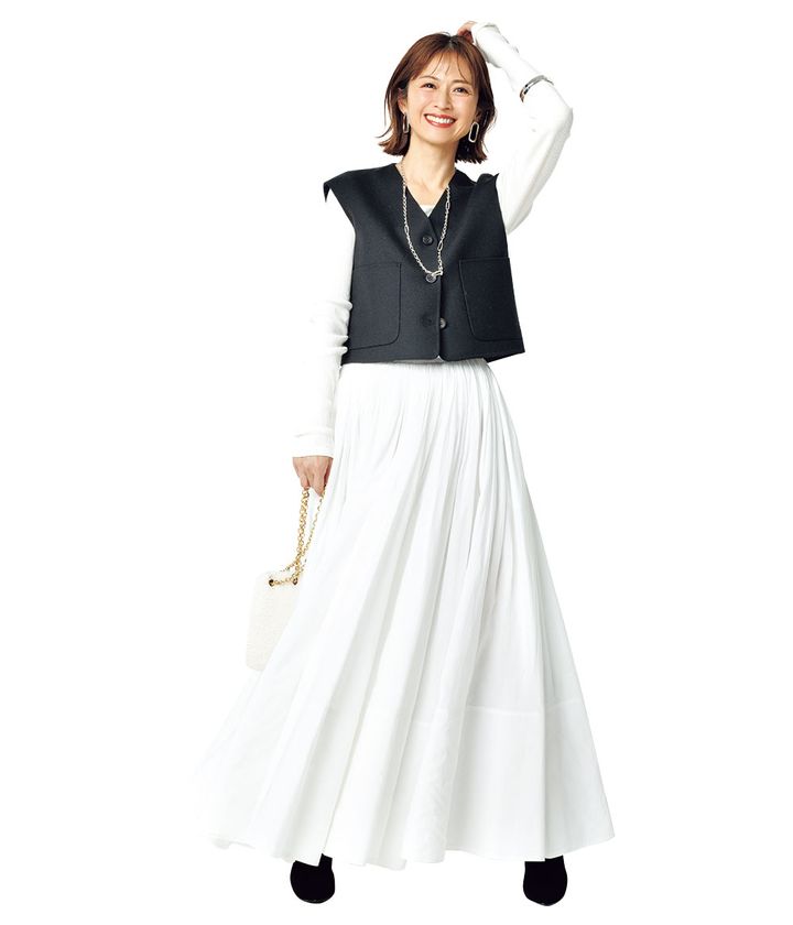 定番化してきたジレ。今季はミドル丈とベストの間の短か丈が気になります。女らしさとマニッシュさを併せ持つデザインが秀逸です。