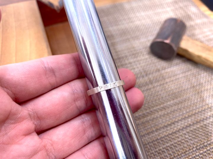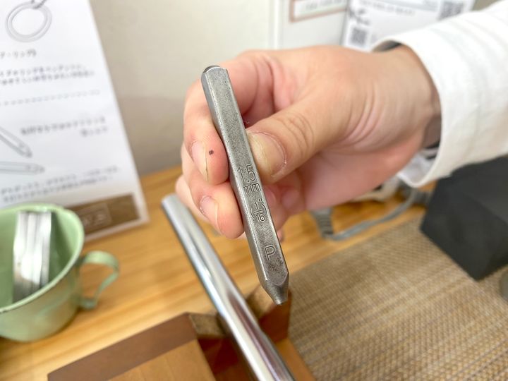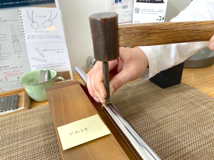 練習用のリングで工具の使い方を学んでから本番なので安心です。プレートの先端には、文字やマークの形の出っ張りがついていて、これをリングに当てたままハンマーで叩くことで文字が刻印されます。
