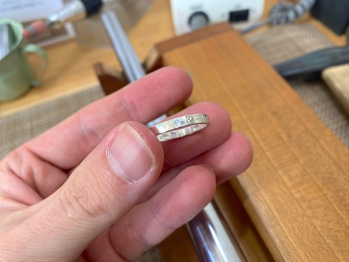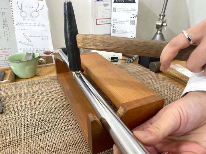 つち目加工は、磨いたあとのリングをハンマーで叩いて凹凸をつけていきます。