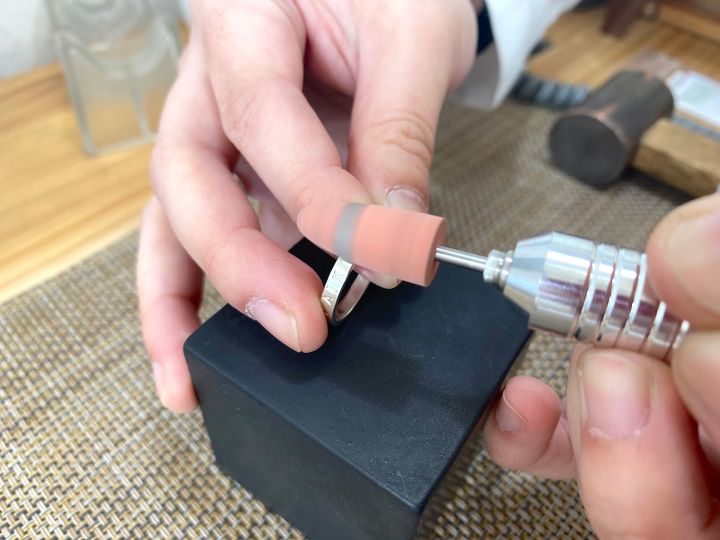 次は電動工具で3〜4周程度磨いていきます。リング表面のくもりがとれていく気持ちよさがたまりませんでした。