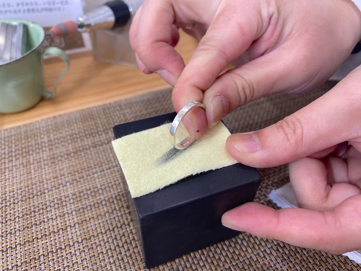 最後の仕上げとして、研磨シートでリングの外側、側面、内側を磨いていきます。磨けば磨くほどピカピカになっていくので、時間をかけて丁寧に取り組みましょう!ちなみにオプションを追加しなかった場合は、電動工具で磨いたあと仕上げ作業に入ります。