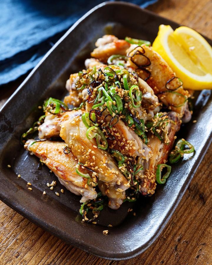 手羽中は塩こしょうでシンプル味付けした後、ごま油を熱したフライパンで焼き、ネギやごまを加えて香りを出すように炒めます。仕上げにレモン汁をかければ、その爽やかな香りに食欲が刺激されるはず!