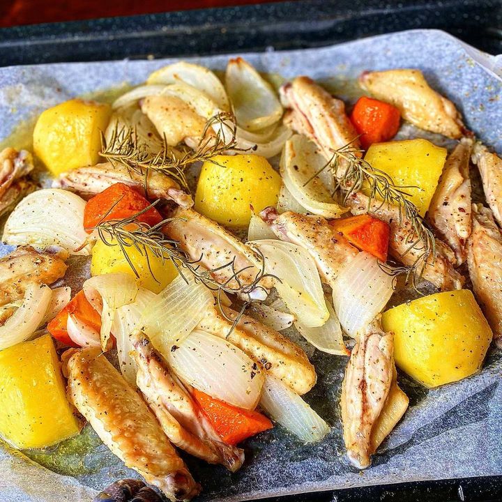 手羽中とオリーブ油、ハーブソルト、お好みの野菜をボールの中で和えて、200℃のオーブンで30分焼くだけで、こんな華やかな一品が完成!