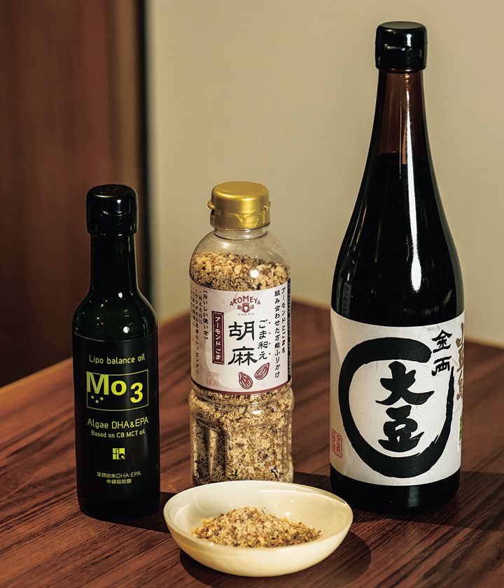 食材も吟味し、美味しくて体に良いものを選ぶように。「Mo3 リポバランスオイル」はMCTオイルと藻類由来オメガ3のブレンドオイル。サラダなどに便利。小豆島・金両さんの「特撰丸大豆醬油」はお醬油の味が重要になる、お刺身用として。AKOM EYAさんの「ごま和え胡麻」はアーモンドや鰹節入りで、何にかけても特別な味に。