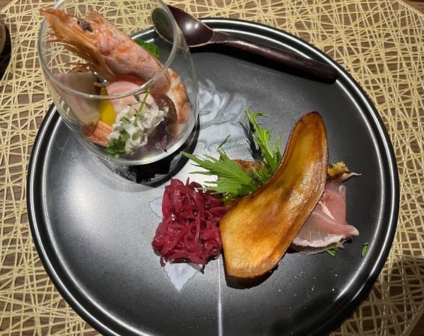 前菜が運ばれてきました。大好きな海老がグラスに入って出てきて、見ただけで気持ちがあがります。