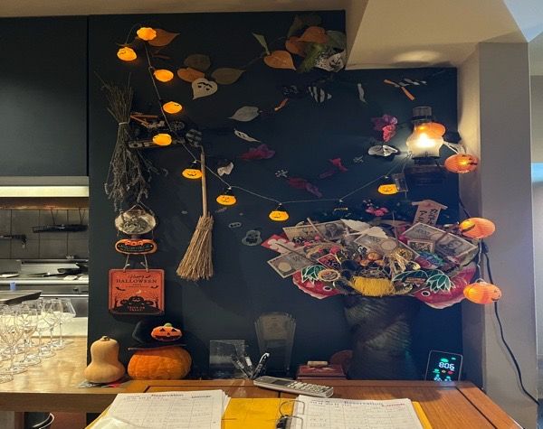 ビルの入り口に小さな看板があり、2階に上がると「Les Amis(アミー)」がありました。中に入ると、季節の可愛い飾りつけ(このころはハロウィーン)が出迎えてくれ、席に案内されました。