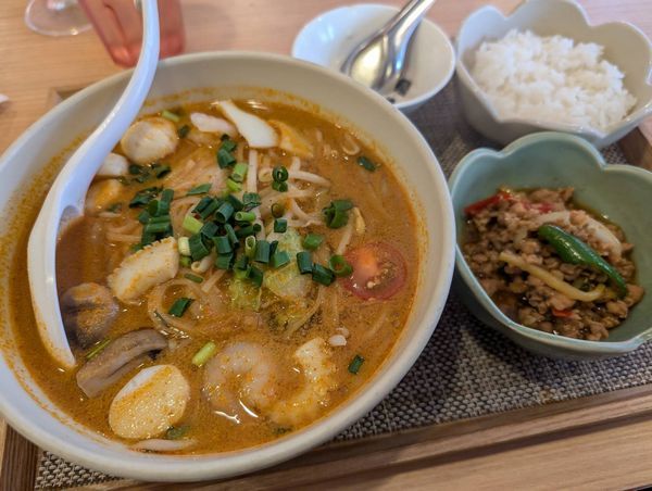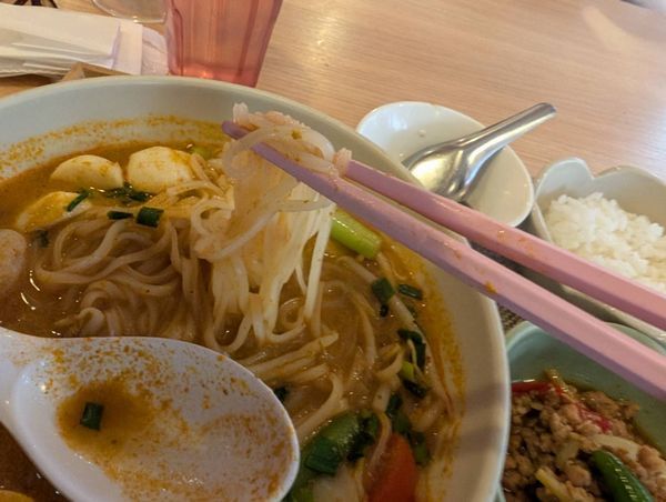 独特のアジア風味が苦手な人でも食べやすいトムヤムスープに弾力のある麺が絡んでうまい!どんぶりみっちりの麺に、具材もたくさん入っていて、ボリュームもバッチリ!