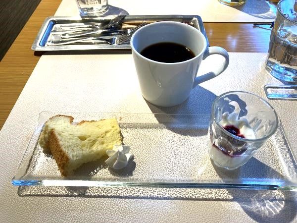 デザートはシフォンケーキとヨーグルト、ドリンクはホットコーヒーを。
