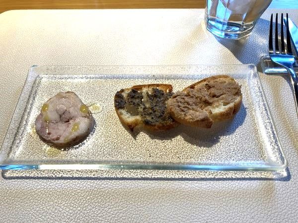 前菜プレートはチキンガランティーヌ(?)に、パテはオリーブが利いていてワインが欲しくなる♪