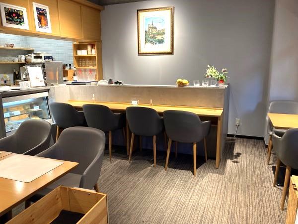 カフェはテーブル席とカウンター席があり、手前のテーブル席の後方にガラス張りのワインショップがあります。