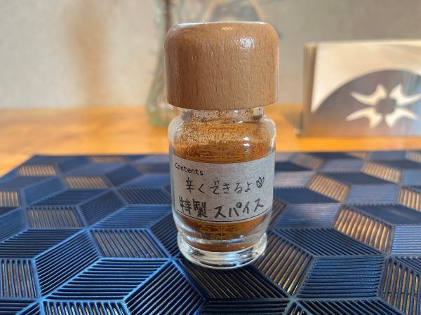 カレー自体は辛くないのでこちらの特製スパイスをかけることで辛さを感じる事ができます。各テーブル毎に置いていますのでご自身のお好みで辛さを調整できます。