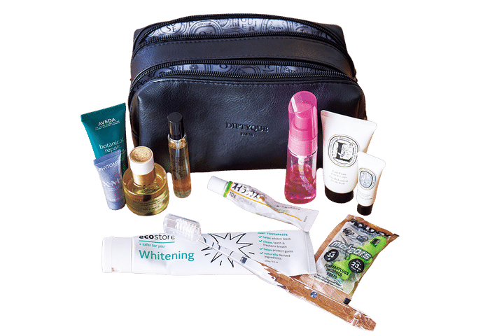 カタール航空のビジネスクラスでもらったディプティックのポーチにエルメスのネイル&オイルなどをイン。
