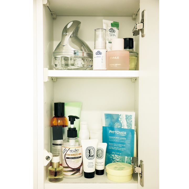 朝用スキンケア&ヘアケア、夜用クレンジングやリファのヘッドスパは扉、メイク系は引出しに。スキンケアはnorm+やHABAを愛用。