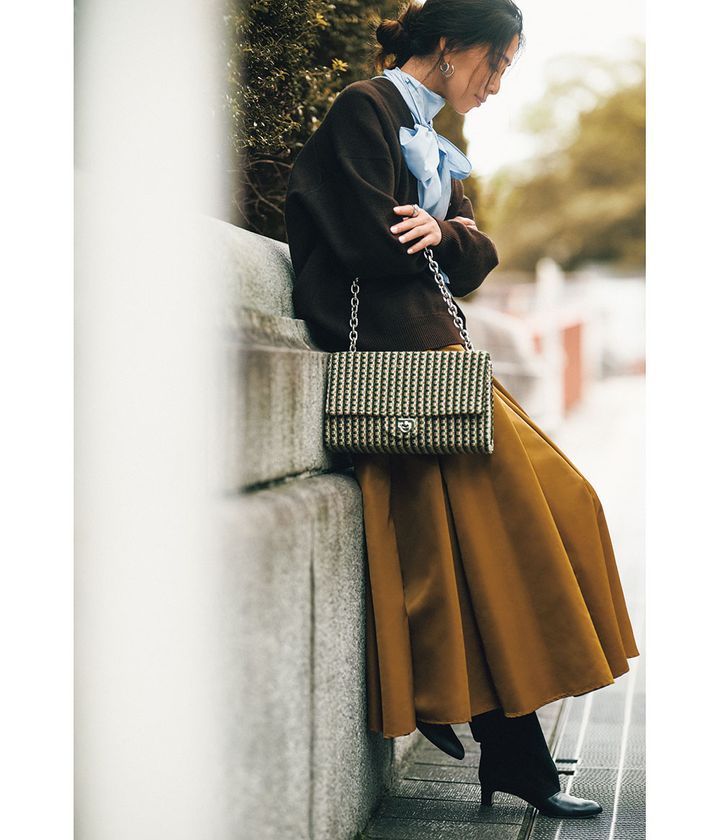 スカート¥55,000(サードマガジン)ニットカーディガン¥26,400(セント ジョンズ サード クラブ/アマン)ブラウス¥18,700(ユナイテッドアローズ/ユナイテッドアローズ 六本木ヒルズ店)バッグ¥36,850(ヴィアメイルバッグ/ティースクエア プレスルーム)ロングブーツ¥99,000(ネブローニ)ピアス¥33,000(ブランイリス/ブランイリス トーキョー)リング¥99,000(ヴァガス/イセタンサローネ東京)