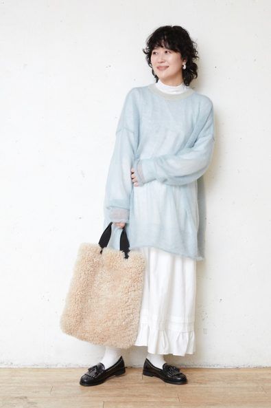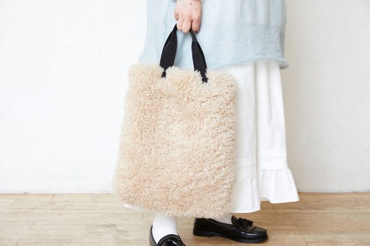 ふわふわのフェイクファーが愛らしいトートバッグ。羊毛のようなカールした毛並みと質感が、着こなしにあたたかみのあるやさしいアクセントをプラスしてくれます。