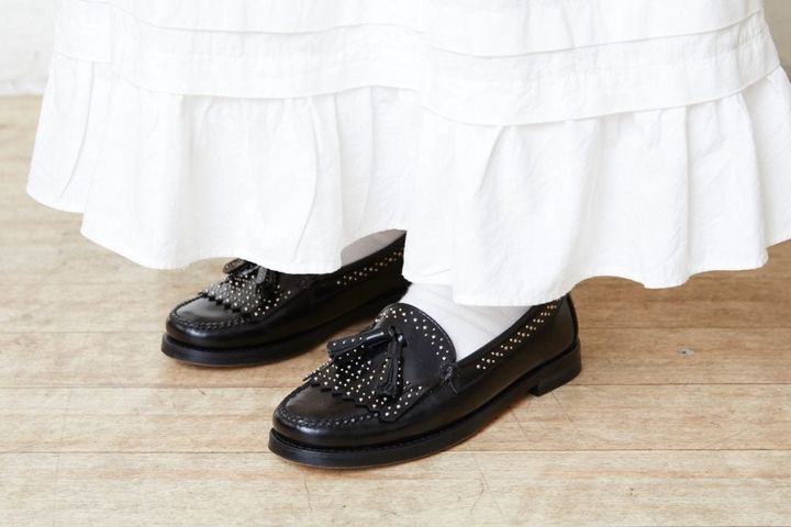 足もとはスタッズ付きのローファーで大人っぽい印象に。ほんの少し辛口なエッセンスを加え、着こなし全体を引き締めてくれる一足です。