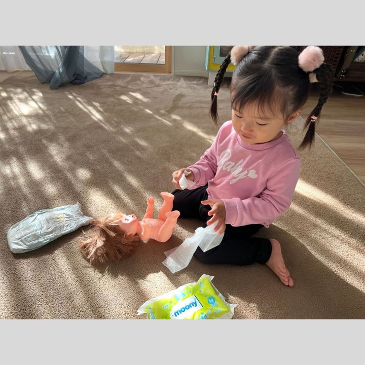 お人形ごっこが好きな長女。おむつがえもせっせとしてくれます(笑)