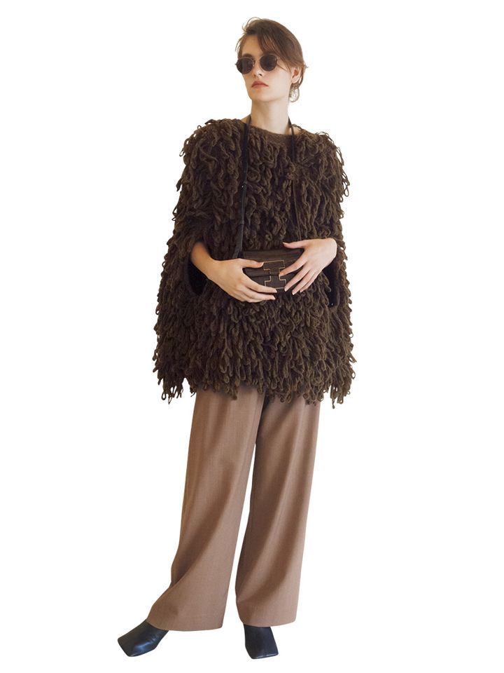 長めのフープ編みでモップライクに。そでがないケープタイプだから、重量感のあるシルエットに抜けも出る。まるでボアコートを着ているかのようなボリューム感で、ブラウン×キャメルのエレガントなニットスタイルをキレイ以上に引き上げ。