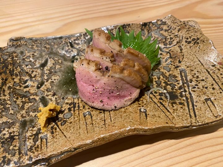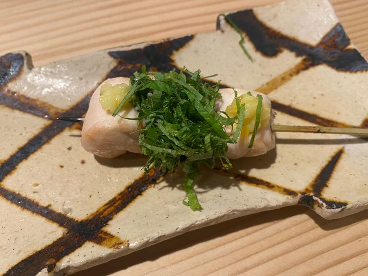 美味しく先付を食べているとあとさささみ焼きが登場。ジューシーなささみ焼きに、青紫蘇が乗ってさっぱりで美味しい!