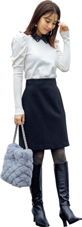 3. 大人のミニスカは短すぎない丈で上品に!「えり付きニット」で作る華やかモノトーン