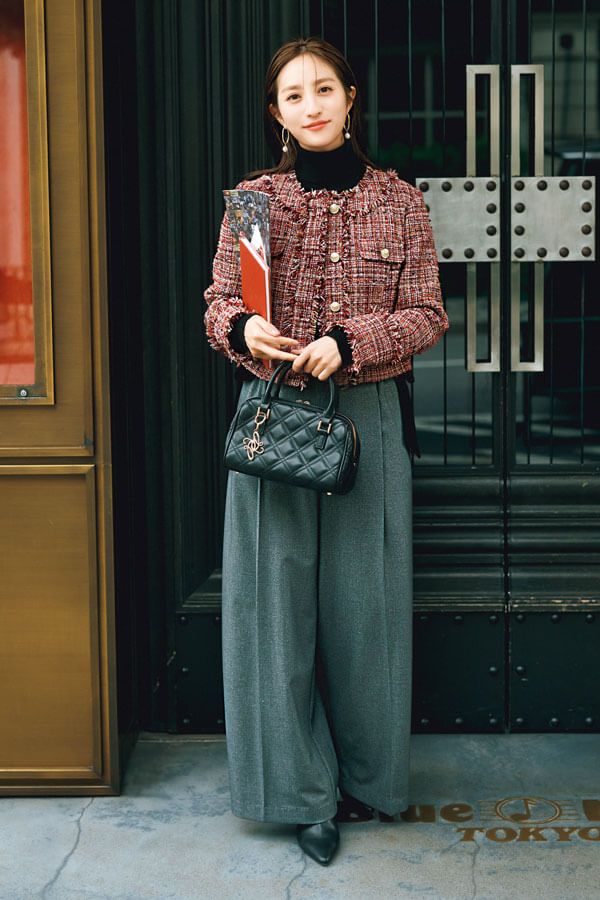 攻めの姿勢を後押ししてくれるグレーは推し活向き。推し色のツイードジャケットを主役にグレーパンツでハンサムにまとめて。センタープレス入りなので脚長効果もあり、ラメ素材でさらに華やかに。