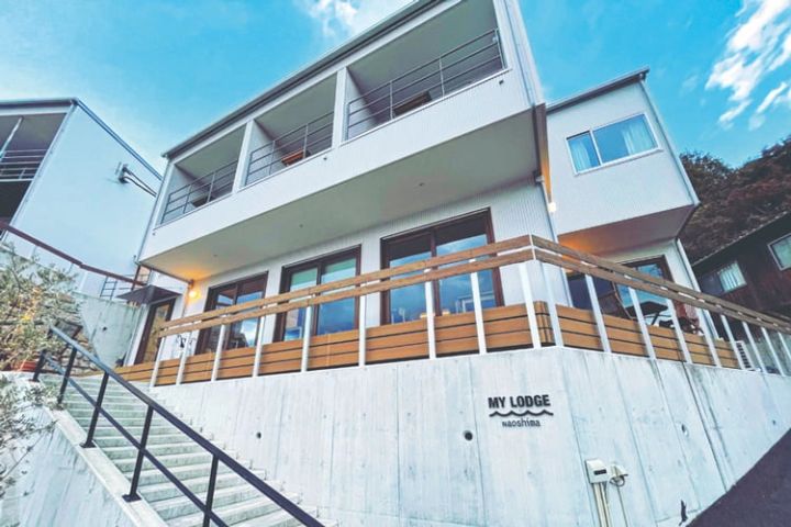 直島の街並みと瀬戸内海を見渡せる斜面に建てられたロッジ。大きな窓からは瀬戸内の陽光と海風が優しく入りこむ、絶景が楽しめるお部屋。エアコンやWi-Fiも完備されたラグジュアリーなお宿。