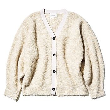 カーディガン/MANOF(クラネデザイン) やさしい印象を決定づける、太めの毛足。ボアのような質感でニットならではのふんわり感を演出。ヒップまでしっかり隠れる丈を選ぶと、防寒だけでなく着映えにも直結。織り込まれたミックスカラーでいっそう柔和に。
