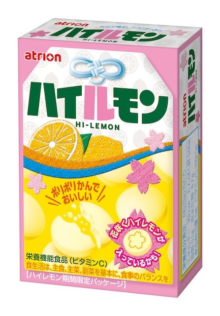 パッケージはお守りをイメージしたデザイン。通常ラッキーアイテムとして入っているニコニコマークのハイレモンは、この時期だけ桜の咲くハイレモンとなります。ぜひ見つけてみてくださいね!