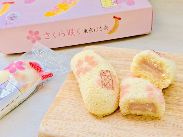 ふんわりとやわらか〜いスポンジにピンクの桜が描かれた、なんとも可愛い東京ばな奈。中に入った桜の香るバナナカスタードクリームもほんのりピンクなんです。バナナの風味もしっかり残しながら、ほんのり桜の香りがアクセントになっています。