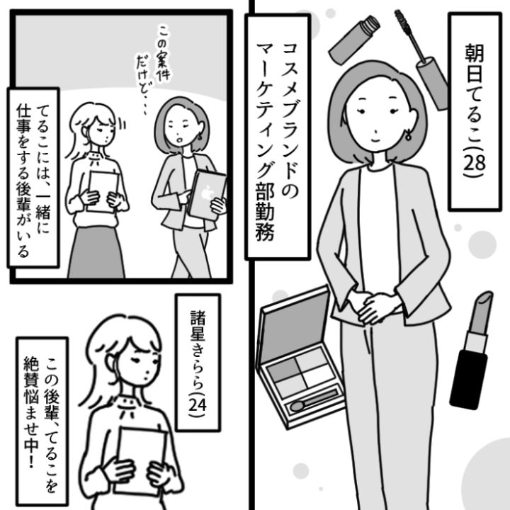 主人公の朝日てるこはコスメブランドの会社で働くアラサー女性。最近後輩のきららに悩まされて少々疲れているようです。このきららの厄介っぷりとは・・・?