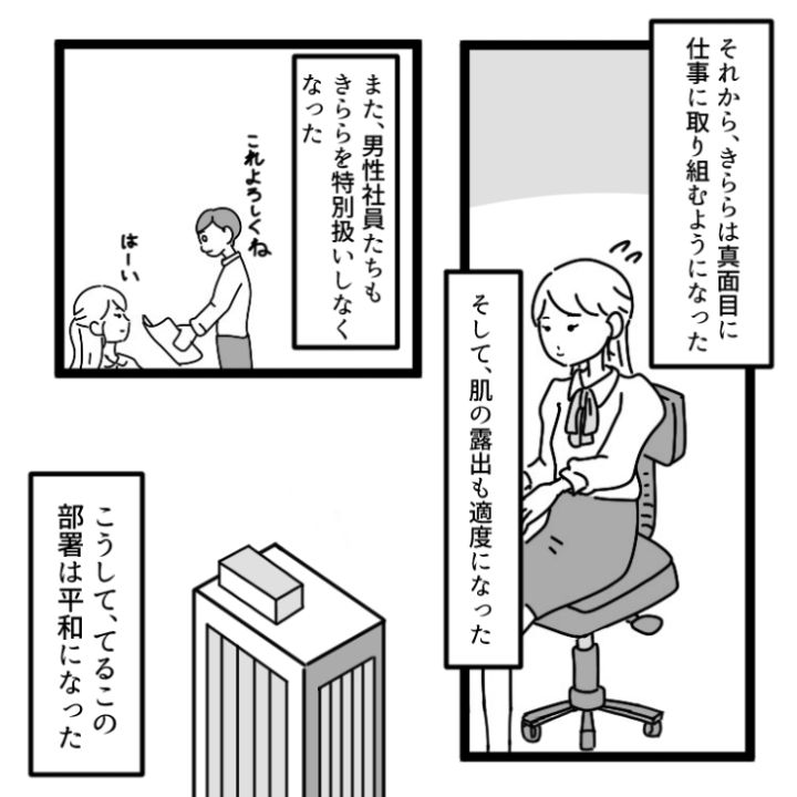 狙っていたイケメン社員から正論パンチをくらい改心したきらら。その後は、肌の露出も少なくなり、仕事も真面目に取り組み始めたようです。