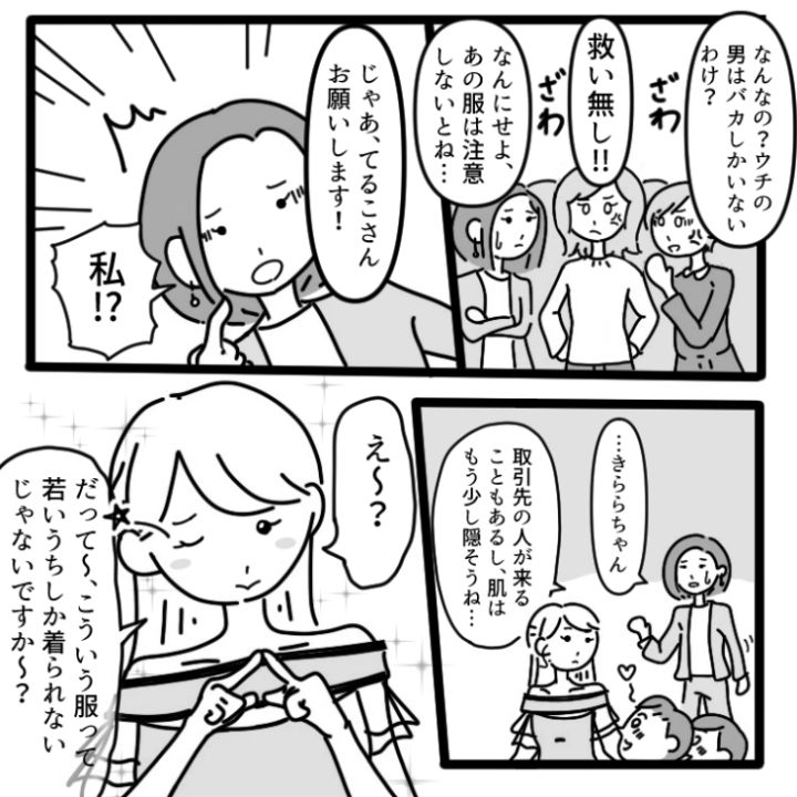 3. 「若いうちしかこういう服着れないし〜」肩出し×ミニスカで仕事に来る女!嫌な業務は男性にやらせ、女性には年齢マウントをとる女に天罰が降った話