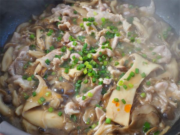 とろとろのあんかけのようなお鍋。食べてみると豚肉は柔らかくジューシー!汁にも旨味が詰まっていて、とろみが豚肉やきのこによくまとわりついています。その旨味が口の中で溶けてあふれ出してきますよ!きのこがたっぷり入っていて食感が程よく残っているし、春雨も入っていてとっても食べ応えがあります。オイスターソースのコク、にんにく、しょうがの効いたパンチのある味でご飯も進みますね〜!ラー油のピリ辛さと、しょうがとにんにくのおかげか、体がポカポカ温まっていくのを感じました。