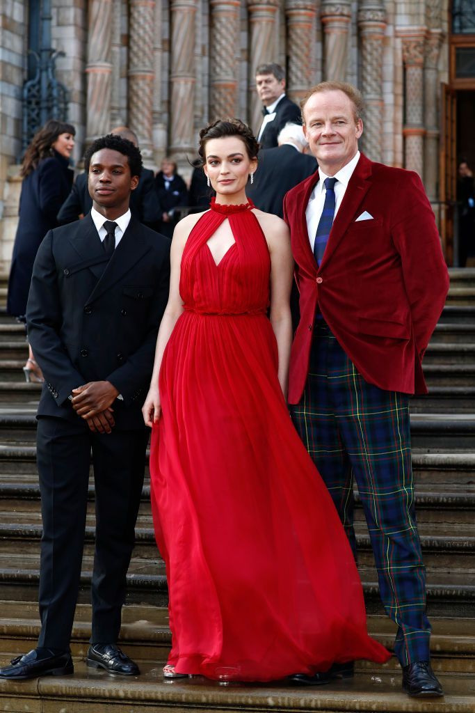アルベルタ・フェレッティのレッドドレスは、フリルのネックラインとホルターネックがフェミニニティを醸し出して。すっきりとまとめた編み込みヘアが、ドレスの雰囲気にマッチしています。2019年4月、Netflixドキュメンタリー「OUR PLANET 私たちの地球」のプレミアにて。