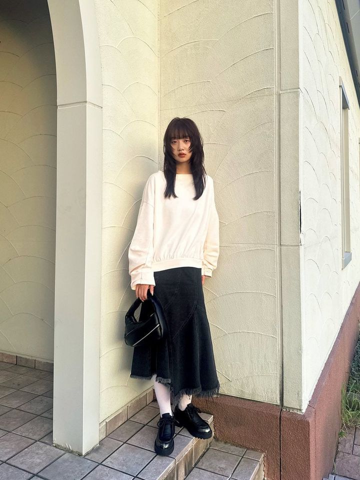 スウェット¥8,998、デニムスカート¥15,180、ソックス¥3,300、シューズ¥15,180 、バッグ¥7,700/以上すべてマウジー(バロックジャパンリミテッド)