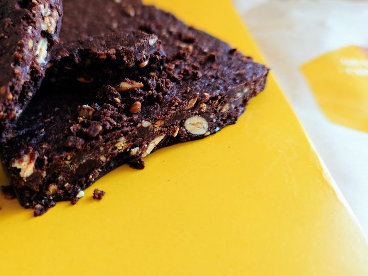 ローストアマニ、チアシード、ヒマワリの種、カボチャの種、韃靼そば茶などの穀物と力強いカカオの風味が調和して玄人好みの1枚。贈り物や自分用のご褒美にしやすく、小さめ・大きめと好きな大きさにカットできるのもうれしい。