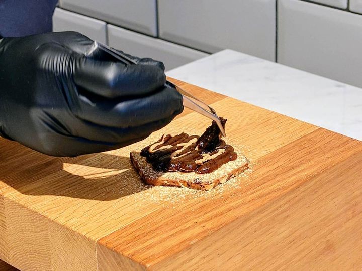 こちらは、日本オープン記念限定「プリューン&キナコ」の仕上げの様子です。きな粉とプルーンが練り込まれたビスキュイの上にプルーンペーストときな粉ペーストを絞り、プルーンと大豆を丁寧にのせ、最後にライムのゼスト(外皮)をふりかけて完成。