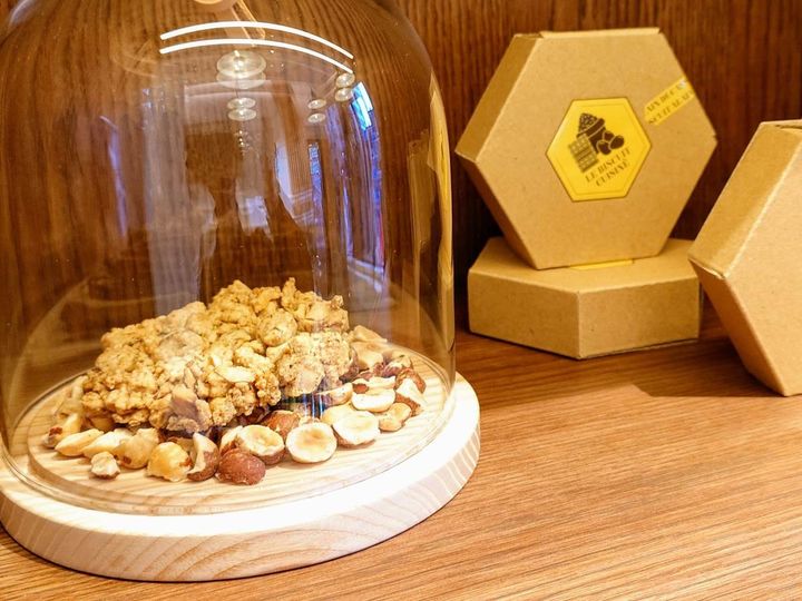 北イタリアのマントヴァ発祥の伝統菓子「スブリソローナ」をイメージした、東京工房ブティック限定「スブリ」。焙煎したポレンタのザラッとした舌ざわりを感じられるクランブルのような食感の六角形のビスキュイ。ゴロっとしたヘーゼルナッツは存在感があり、バニラや柑橘が甘く爽やかに広がります。