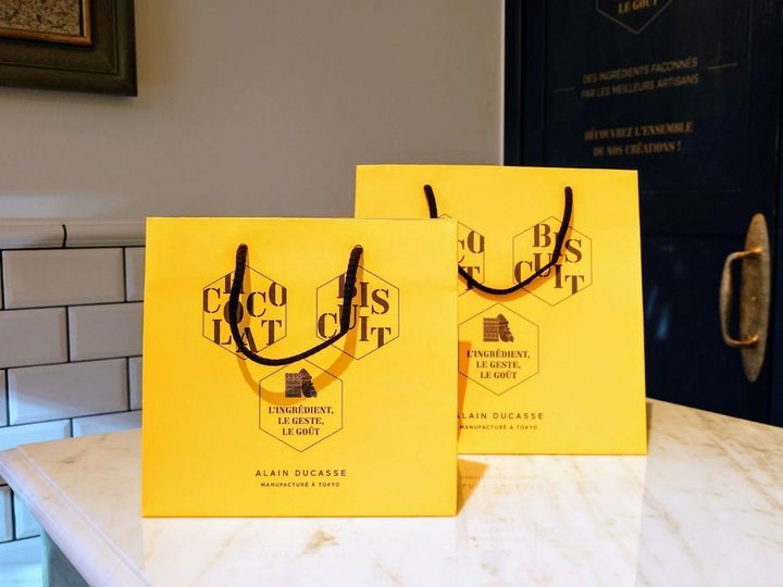 無料の紙袋のほか、ブランドを象徴した六角形をデザインしたショップバッグ(有料)もあります。鮮やかな黄色が目を引きます。