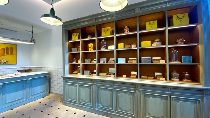店内は「お城のキッチンが街にやってきた」がコンセプト。パリ本店と同じブルゴーニュ産のタイルを床に敷き詰めて、昔ながらのパン屋のにある大理石のテーブルをイメージしたカウンターや薄緑色の棚をセットし、外光が降りそそぐ温もりのある雰囲気です。扉の取っ手、照明にいたるまでアンティークにこだわっている装いに。