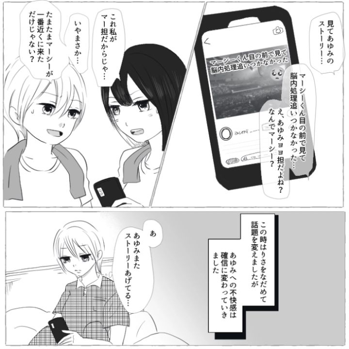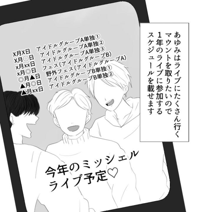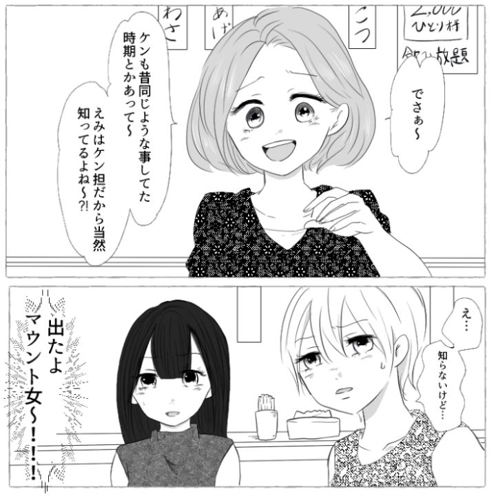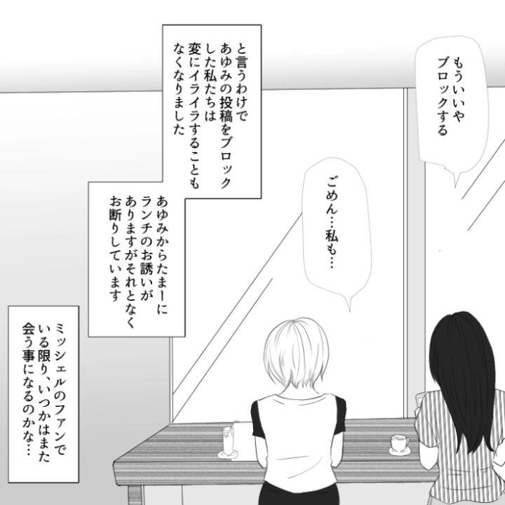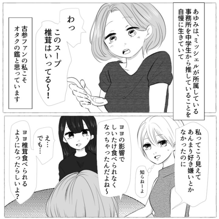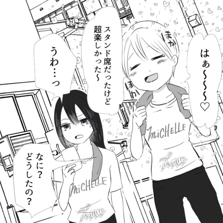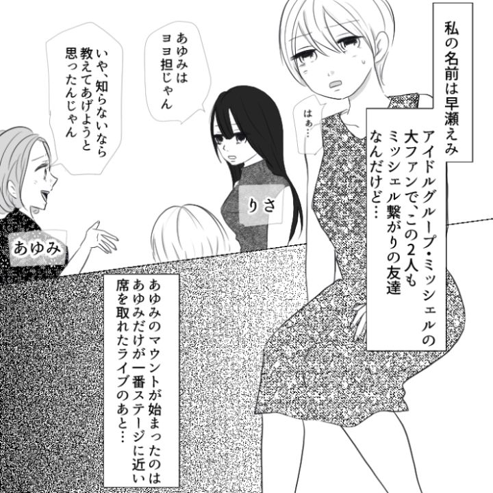 主人公はアイドルグループ〝ミッシェル〟のファン。その繋がりで仲の良い友達がいるのですが、このうち1人が厄介な〝マウント女〟だったのです・・・。
