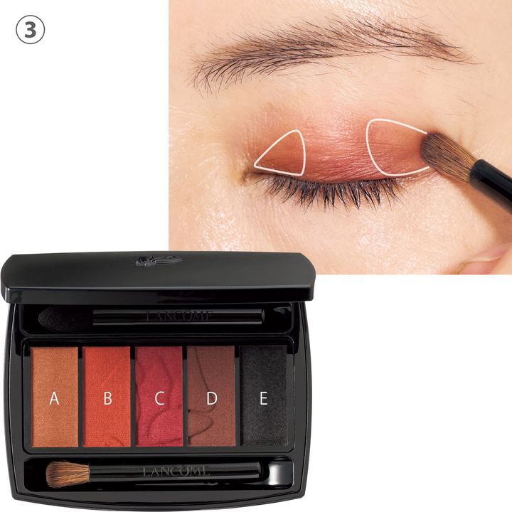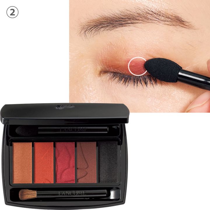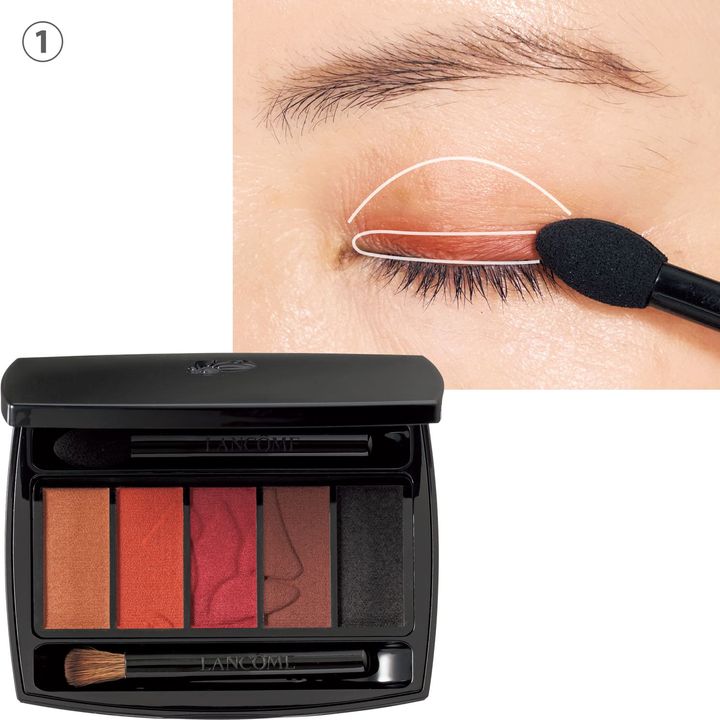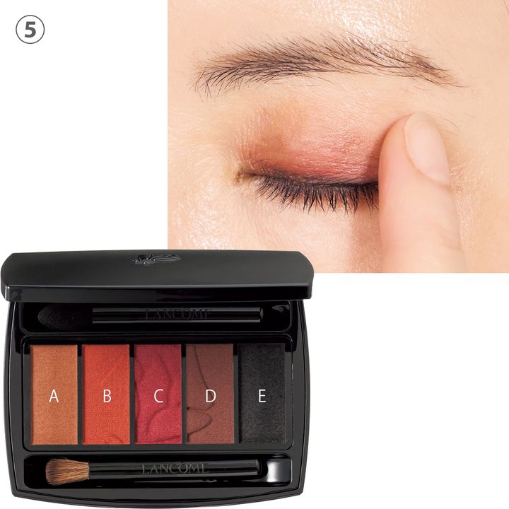 ❶Aをブラシでアイホール全体にぼかし、さらにBをチップに取り二重幅に重ねて馴染ませます。❷Cの赤をチップに少量取り、まぶたの中央、黒目上の位置に重ねると縦幅が強調され華やかに目力UP。❸Dのブラウンをブラシに取り、目尻側と目頭側にかけてより立体感を作ります。❹チップの側面を使って、Eの締め色でシャドウラインを入れ、さらに下まつ毛の際1/3にAを入れ、フレームを強調。❺アイシャドウの色を重ねるたびに、指で優しくぼかし、まぶたに馴染ませながら調和させるのがコツ!その都度しっかり馴染ませておくことで長時間ヨレにくくもなります。ランコム イプノ パレット 19 アルダン ドラマ ¥9,020(ランコム)