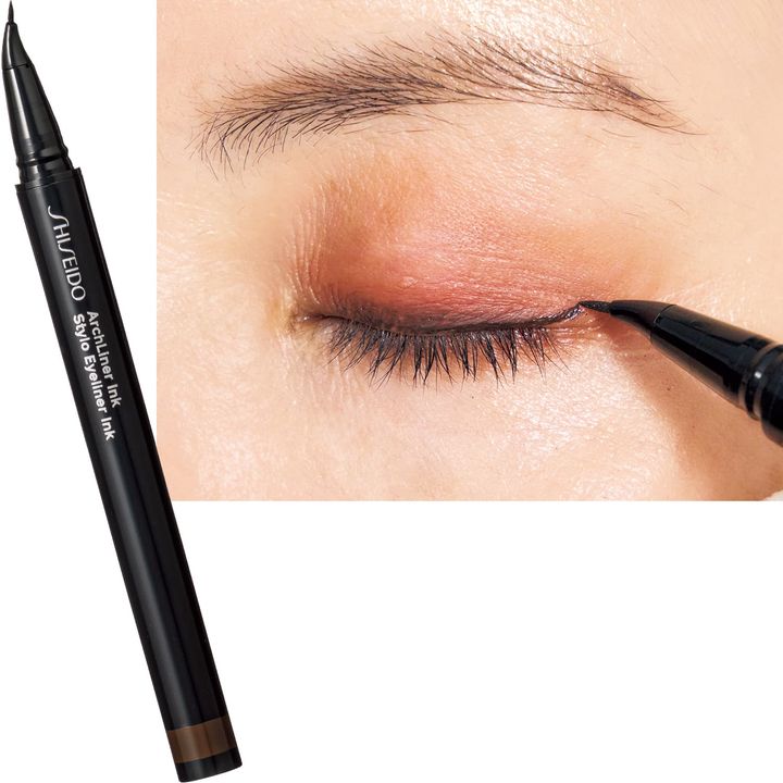 質感の違う焦茶で、目のフレームをさりげなく強調すると、より自然な仕上がりに。極細筆で描きやすいリキッドアイライナーで上まつ毛の間を埋めるようにラインを引きます。目尻は少し長めに平行に。まつ毛のすき間が簡単に埋められて瞳が輝く。SHISEIDO アーチライナーインク 02 Hojun Brown ¥3,850(SHISEIDO)