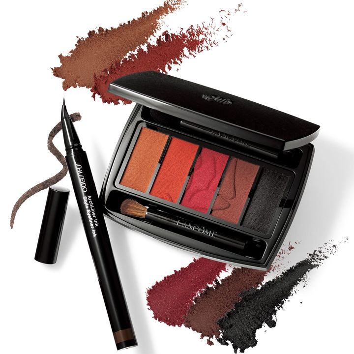 左:肌馴染みの良いブラウンカラーが絶妙。カーブした極細の筆先はコシがあり繊細なラインもするすると描ける。目元をナチュラルに強調しつつ、まなざしのくっきり度をアップ。SHISEIDO アーチライナーインク 02 Hojun Brown ¥3,850(SHISEIDO)右:華やかな赤を含む5色パレットで奥行きのある目元を演出。使う色数やアイシャドウを広げる範囲の調整で、普段からパーティまで仕上がりは自由自在に楽しめます。LANCÔME イプノ パレット 19 アルダン ドラマ ¥9,020(ランコム)
