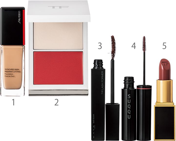 1:透明感のある美肌を叶える優秀ファンデ。SHISEIDO シンクロスキン ラディアントリフティング ファンデーション SPF35・PA++++ 220 Linen 30ml ¥6,600(SHISEIDO)2:上品な艶感で、顔の立体感を際立たせます。トム フォード ソレイユ ネージュ ブラッシュ ハイライト デュオ 01S ハイ アルティチュード ¥11,500※限定発売(トム フォード ビューティ)3:抜け感のあるブラウンが目元を優しく彩り、際立たせます。ケイト ラッシュバースト BR-1 ¥1,540<編集部調べ>(カネボウ化粧品)4:落ち着きのあるモーヴカラーで眉の表情をやわらかくチェンジ。SUQQU カラーリング アイブロウ 03 モーヴ ¥3,520(SUQQU)5:絶妙な色艶、ヌーディな赤みで唇を彩り肌色まで美しく。トム フォード リップカラー N3 ウエスト コースト ¥8,250(トム フォード ビューティ)