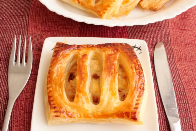 半分に切ってみると、パイ、ミートソース、チーズ、パイと4層になっています。粗熱を取った温かい状態で食べてみると、パイがサクサクッと軽く、バターのまろやかな風味がふわり♡ケチャップの甘さが効いたまろやかなミートソースとチーズのおいしさが、後からやってきます♪